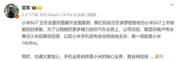 不久前,小米创办人、董事长兼 CEO 雷军宣布:" 公司决定,集团总裁卢伟冰兼任小米品牌总经理,以后小米手机发布会也将由他主讲,第一场就是小米 14Ultra。"