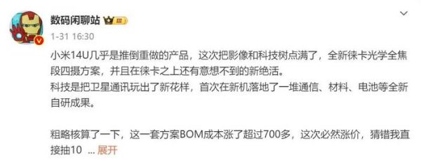 而在此基础上,这一代小米 14 Ultra 也有很大的可能会进行涨价。爆料中提到," 粗略核算了一下,这一套方案 BOM 成本涨了超过 700 多 "。