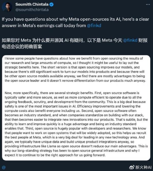 至于为何选择开源路线,Meta也不藏着掖着,其坦言开源软件提高了效率,降低了计算成本,让包括Meta在内的每个人都受益。更重要的是,开源软件通常会成为行业标准。当其他公司使用 Meta 的技术栈进行标准化构建时,Meta 就能很容易地将其他公司的创新整合到自己的产品中,这将是一个巨大的优势。而且开源在开发者和研究人员中非常受欢迎,也有助于 Meta 招募到最好的人才。