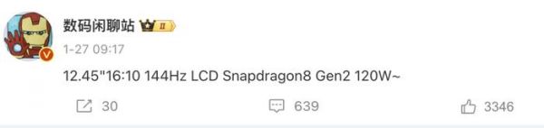 近日,@数码闲聊站曝光了一款安卓平板的参数:12.45英寸144Hz LCD屏幕、骁龙8 Gen 2芯片、120W快充。更早些时候,一款型号为“24018RPACC”的小米平板电脑出现在了国家质量认证网站上,暴露出它的最高充电功率为120W。现在看来,它们是同一款产品。