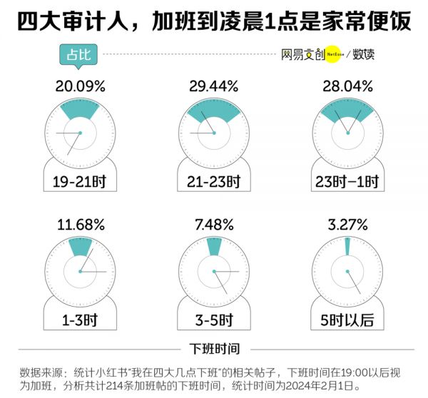 这意味着,淡季里的闲暇,代价可能是年审季里死命加班的“卷生卷死”。我们统计了小红书上“四大”打工人的加班记录,结果是能在晚上九点前结束加班的只有五分之一左右,甚至有人能直接见到第二天清晨的阳光。