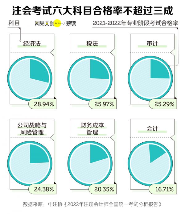 单科也都不简单。从 2022 年考试结果来看,审计科目的通过率不过四分之一,最难的科目会计,合格率则掉到了16.71%。审计的考试成绩分布集中在 55~65 分之间,是真正的“六十分万岁” [6]。