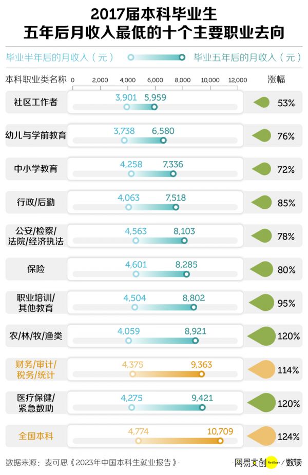 忙起来觉得互联网“996”都是福报的审计人,薪资却相形见绌。近五年,财务/审计/税务/统计的毕业生五年后收入水平甚至低于全国水平,涨幅也同样不高 [8]。