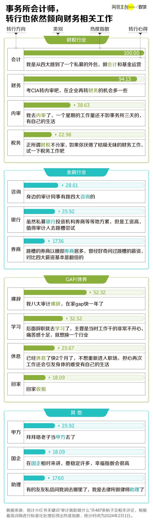 但转行也像个围城。审计人转行,固然去向五花八门,图财跳金融,性价比选企业,家里有矿也能回去先做全职儿女,但彻底转行的还是少数。
