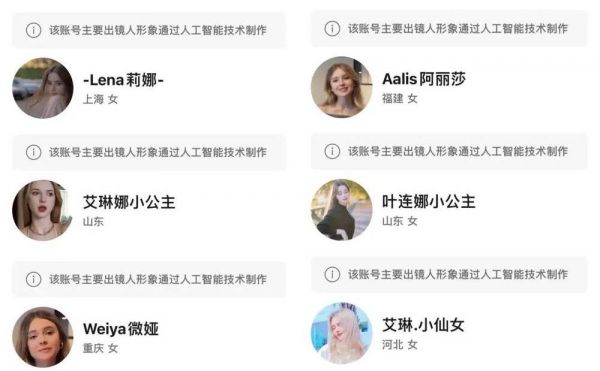 这些俄罗斯美女都是 AI,平台贴心地标注了。通过她们虚化夸张的模糊背景、没抠好的头发丝、循环的几套表情和动作、过于接地气的台词,我们也能分辨一二。