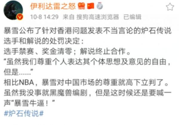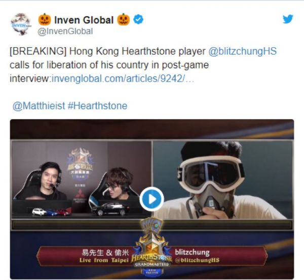 近日,中国香港一个网名为“Blitzchung”的电竞选手,被人发现在参加美国暴雪公司组织发起的电竞赛事“炉石传说特级大师赛”的一场比赛时,竟公然喊出支持乱港暴徒的口号。