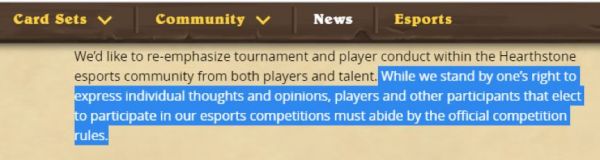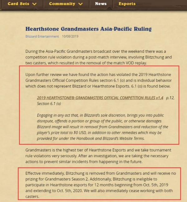 今天,暴雪方面已经就此事做出了严肃的处理。从一份官方声明来看,暴雪公司认定这起事件违反了“炉石传说特技大师赛”的官方比赛规则的第6.1(o)条例,即“若从事或参与任何经过暴雪认定的,涉嫌公众争端、冒犯大众或某些大众群体、或其他破坏暴雪形象的行为,将受到取消参赛资格并将奖金清零的处罚”。