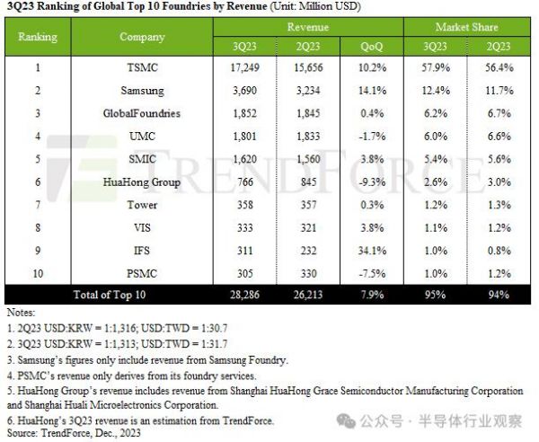 根据TrendForce在去年12月的研究报告,台积电在2023年第三季度营收同比增长 10.2%,达到 172.5 亿美元,得益于 PC 领域和智能手机零部件(包括新款 iPhone 和 Android 设备)的强劲需求,以及补充中低端 5G 和 4G 库存的紧急订单,仅3nm工艺就为台积电Q3营收贡献了6%,其中先进工艺(≤7nm)占其总营收的近60%。