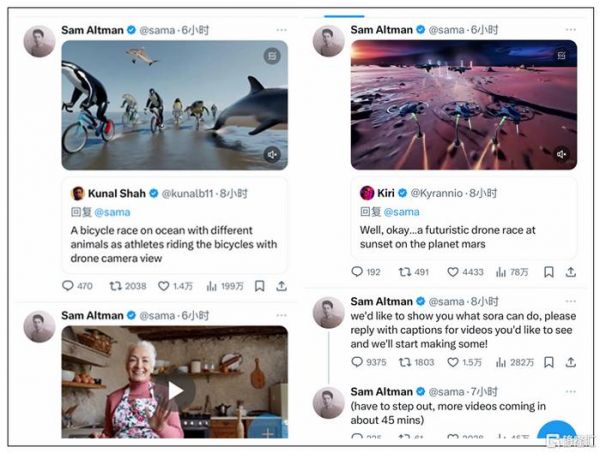 OpenAI创始人兼CEO山姆·阿尔特曼在海外社交平台X上疯狂刷屏,各种展示生成的视频效果。网友们也炸了锅,微博上有达人激动地写道:“这生成质量和运镜幅度直接把我看醒了……”