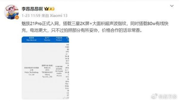 还有,数码博主 @李昂昂昂啊 也曾在爆料中提到,“魅族21Pro正式入网,搭载三星2K屏+大面积超声波指纹,同时搭载80w有线快充,电池更大,只不过拍照部分有所妥协,价格合作的话非常香。”也就是说,魅族21 Pro还将支持80W有线快充,配备更大容量的电池,影像配置方面“有所妥协”。