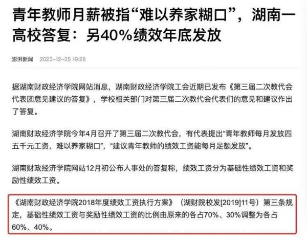 2023年12月末有个网红事件颇受关注,湖南长沙的“湖南财政经济学院”有教师代表向学校反映:“青年教师每月发放四五千元工资,难以养家糊口。建议青年教师的绩效工资能每月足额发放”。湖南财政经济学院网站12月初公布人事处的答复称,绩效工资分为基础性绩效工资和奖励性绩效工资,根据学校的相关方案,基础性绩效工资与奖励性绩效工资的比例由原来的各占70%、30%调整为各占60%、40%。