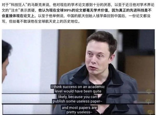 绝大部分所谓的科研论文都是垃圾,这个绝大部分恐怕超过了99%。这话不是我说的,是“科技狂人”马斯克说的。马斯克对现在的学术论文感到十分厌恶,他对学术界论文的“注水”表示质疑,他认为现在全球99%的论文都毫无学术价值,因为真正的先进科技是不会直接体现在论文上的。以至于他举例说,中国的航天创始人钱学森回到中国后,一份论文都没写,但丝毫不耽误他在全球航天史上的历史地位。