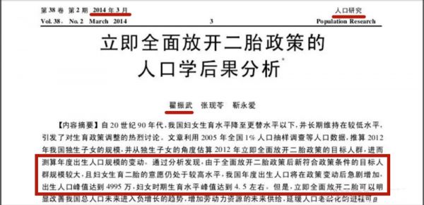 还有近年来被人们诟病的学界对人口学的研究,中国人民大学社会与人口学院原院长、中国人口学会原会长、著名教授翟振武2014年还发表论文,反对国家放开二胎,认为放开二胎我国每年出生人口峰值将达到4995万,有他的论文为证。