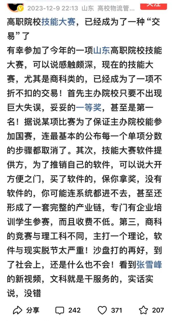 可是职业技能竞赛的内幕是什么样的呢?网上有很多职业院校的老师现身说法,基本上揭示了职业技能大赛这个游戏的内幕,我截几张图片,以飨读者: