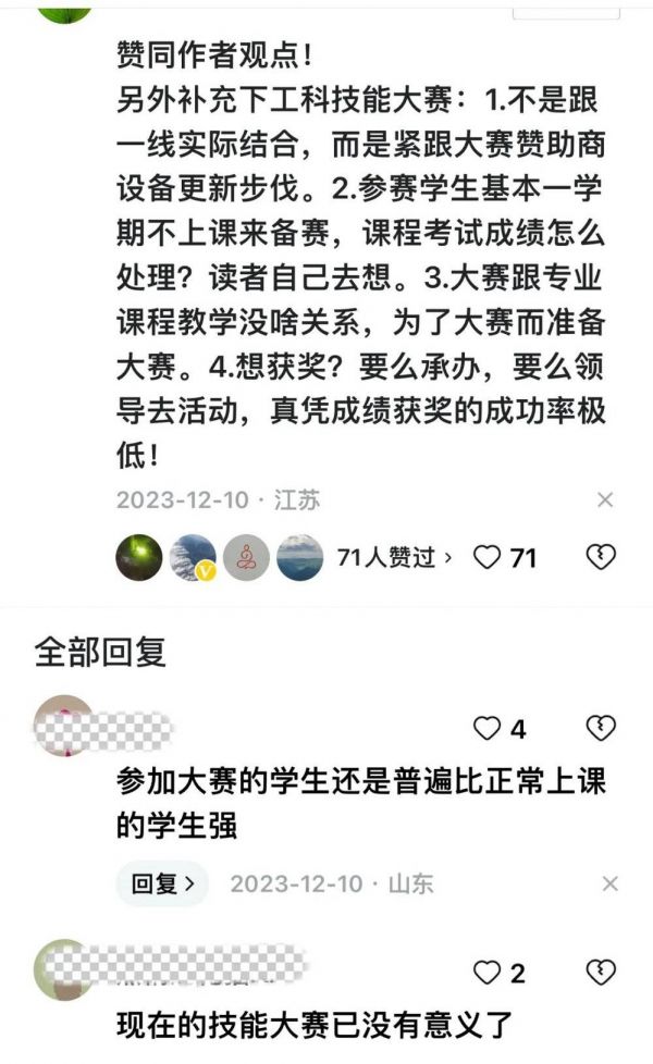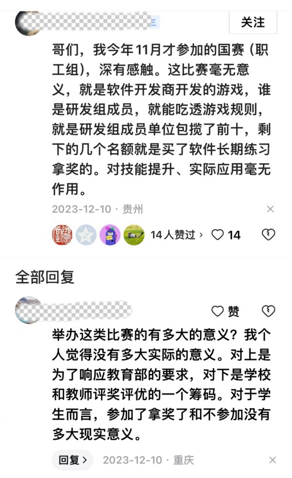 从IP地址看,这是全国多个省市的职业院校老师的现身说法,点赞评论的那么多,可见这个帖子讨论的现状是能够代表全国范围内职业技能大赛现状的。