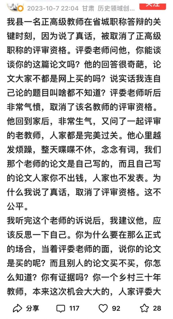 不要认为我把这些事说得太严重,我没有以点概面,更没有给教师泼污水,我身处教育行业,我感同身受。而且读者不用相信我一人的言辞,你们可以上网去搜去看相关信息。记得2023年10月,一条帖子成了热点,帖子说:我县一个老师参加正高级职称的评审答辩时,当着评委的面公开承认自己的论文是在网上买的,自己连论文题目是啥都不知道。评委听了很生气,取消了这位老师的评审资格。这位老师很委屈,说我们哪个老师的论文是自己写的?还不都是买的,我只是说了真话,为什么取消我的评审资格,这不公平!