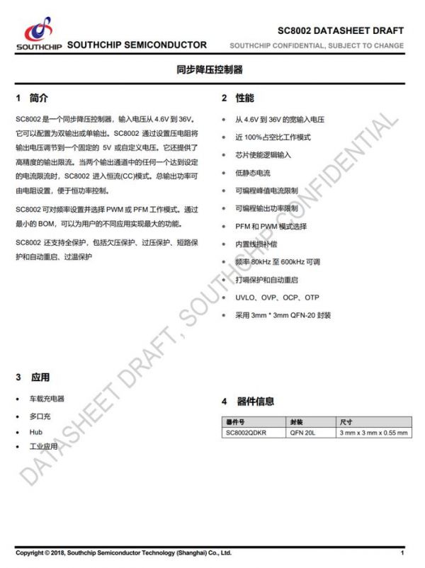 芯片内置包括欠压保护、过压保护、短路保护等全面完善的保护功能。SC8002采用QFN3*3-20封装,可用于车充,多口充电器,USB HUB等应用。