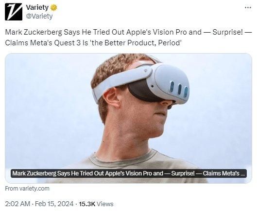 (来源:Twitter)扎克伯格在视频中说:“我不得不说,在此之前,我认为Quest对大多数人来说会更有价值,因为它真的很好,而且便宜了7倍。但在使用了Vision Pro之后,我不仅认为Quest更有价值,而且认为它是一个更好的产品周期。”