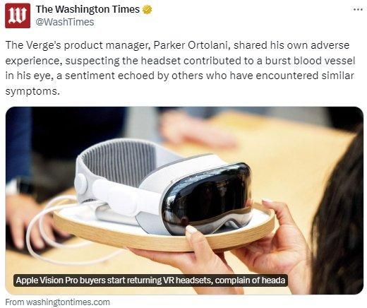 (来源:Twitter)The Verge产品经理Parker Ortolani认为,他使用Vision Pro导致他的眼球血管破裂,至少还有一个人也指出了类似的发红经历。公平地说,多年来,VR耳机用户一直报告眼睛干涩和发红。