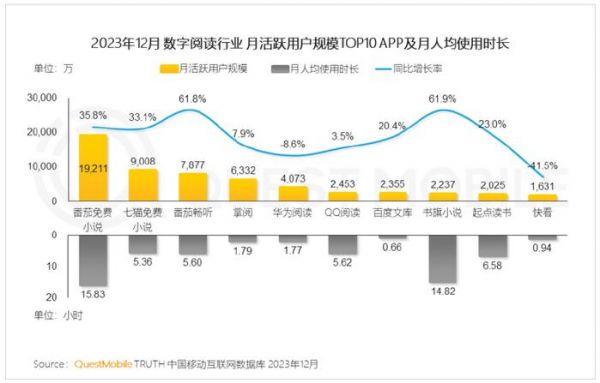 番茄小说已是国内数字阅读领域头部玩家。调研机构QuestMobile数据显示,番茄小说位列2023年12月国内数字阅读行业MAU(月活跃用户数)规模首位,MAU为1.92亿,同比增长35.8%;其后是七猫小说,MAU为0.9亿;掌阅以0.63亿的MAU排行第四,书旗小说和起点读书(起点中文网官方APP)以2237万和2025万分列第八和第九。