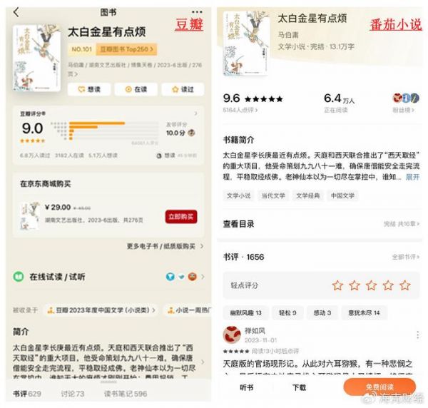 平台选择提升质量的方式之一是购买版权。此前番茄小说上线了来自掌阅、中文在线、书旗等平台的《元尊》《剑来》《神医嫡女》等知名网文,比如作者“烽火戏诸侯”的作品《剑来》首发于纵横中文网,豆瓣评分7.3分,番茄小说只是其免费渠道之一。写有《风起陇西》《长安十二时辰》的著名作者马伯庸,其新作《太白金星有点烦》发布纸质版外,电子版免费首发也在番茄小说。