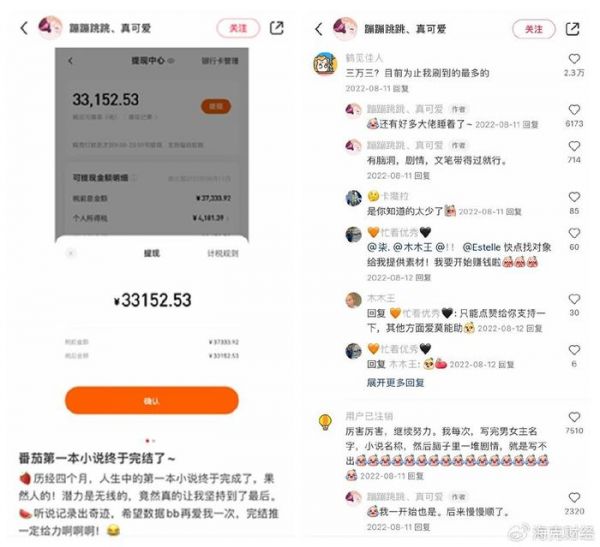 比如用户“蹦蹦跳跳真可爱”在小红书展示自己从番茄小说收获的稿费截图,称用4个月完成了人生的第一部小说,收入为3.3万元,并表示自己只是普通作者水平,还要向优秀作者学习。在笔记评论区,有大量用户表示这个收益已经相当高了,还有不少同为作者的用户推荐自己的网文。