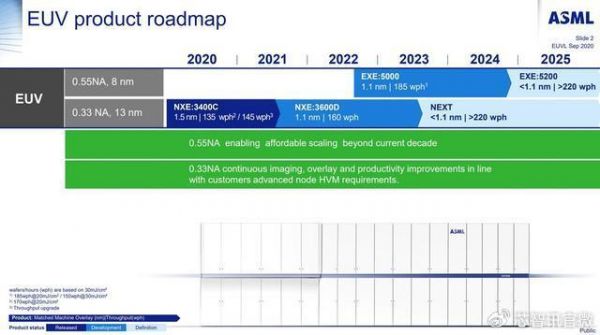 目前ASML已经开始交付的首款High NA EUV系统(EXE:5000)数值孔径已经由传统EUV的0.33提升到了0.55,分辨率也由13.5nm提升到了8nm,可以实现16nm的最小金属间距,对于2nm以下制程节点将非常有用。根据Imec的预计,这即使对于1nm节点技术,High NA EUV系统也能提供解决方案。另外,在生产效率方面,High NA EUV系统每小时可光刻超过 185 个晶圆,与已在大批量制造中使用的 EUV 系统相比还有所增加。ASML还制定了到 2025 年将新一代High NA EUV系统(EXE:5200)的生产效率提高到每小时 220 片晶圆的路线图。