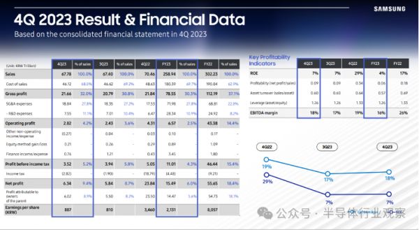 2023年全年,三星电子的营收为258.94万亿韩元,同比减少14.32%;营业利润为6.57万亿韩元,同比减少84.85%。