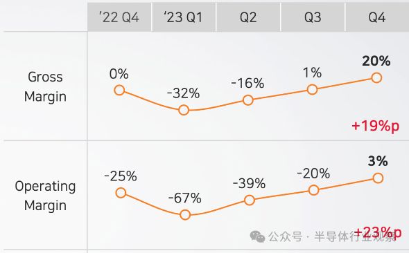 但其2023全年仍在亏损中,SK海力士2023年实现营收32.766万亿韩元,经营亏损7.73万亿韩元,经营利润率-24%。