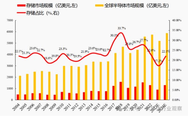 全球半导体和存储市场规模及占比(亿美元,%),图源:WETS、国联证券研究所