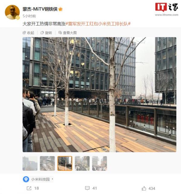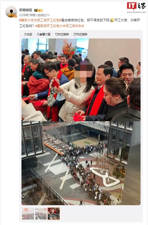 微博认证为小米高级产品经理的账号 @蒙杰-MiTV 钢铁侠 今日早间发微博称,小米员工排长队在准备领取雷军发的开工红包。另有小米员工对中新经纬表示,“这次开工红包面额大多为 50 元或 100 元,只要排队去领就有,是雷总(雷军)在发。”图片显示,小米公司的创始人雷军和品牌总经理卢伟冰等高管也亲临现场,他们身穿红色围巾,面带微笑,亲手为每一位员工发放红包。