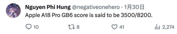 在芯片产品上,苹果的保密工作其实一直做得还不错。关于下一代A系列芯片A18 Pro,目前相关的爆料信息还不算多。日前,推特上一名爆料博主称,苹果A18 Pro的GeekBench 6跑分大概是单核3500、多核8200。作为对比,搭载A17 Pro的iPhone 15 Pro,在GeekBench 6中的一个跑分案例为单核2906、多核7231。如果以此来计算的话,A18 Pro的单核性能提升了20%,多核性能提升了13.4%。