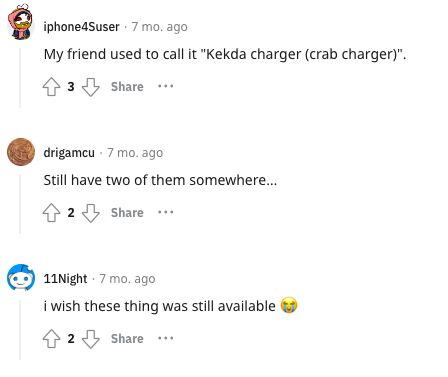 “我朋友叫它‘螃蟹充电器’。”“现在我家某个地方还放着俩。”“我希望这东西还能用。”