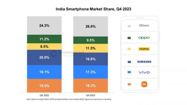 2023年第四季度,在印度智能手机市场,小米、vivo、三星的市场占有率分别为18.3%、17.3%、16.8%,竞争格局又微妙了起来。