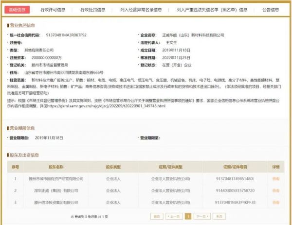 国家企业信用信息公示系统显示,正威华能成立于2019年11月18日,注册资本金20亿元。公司的经营范围主要包括铜材、电线、电缆等产品的生产和销售。从股权结构来看,王文银控制的正威集团持有正威华能80%股权,其余20%股权由滕州市国有资产监督管理局控制的两家公司持有,持股比例均为10%。