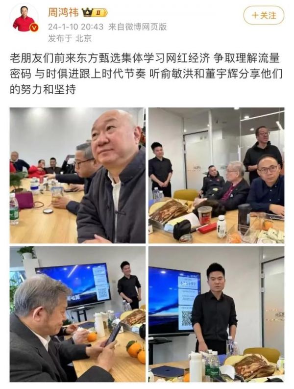 “老朋友们前来东方甄选集体学习网红经济,争取理解流量密码,与时俱进跟上时代节奏,听俞敏洪和董宇辉分享他们的努力和坚持。”周鸿祎在微博中还贴上了多张现场照片。