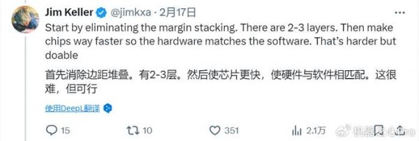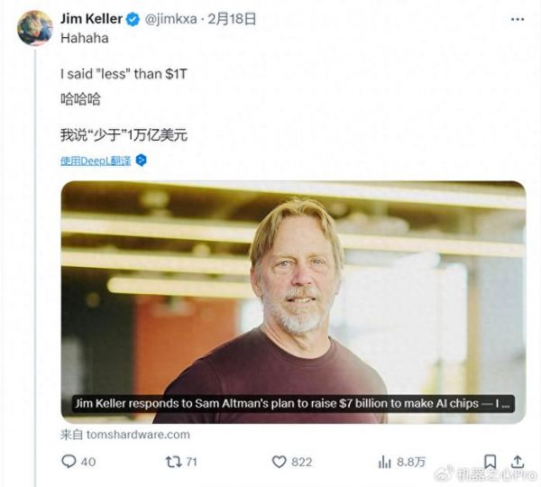 最近,硅谷芯片大神、“硅仙人”、Tenstorrent CTO Jim Keller 也在 X 上表达了他对 Altman 令人震惊的野心的“意见”,他强调,同样的工作,他可以以不到一万亿美元的价格完成。