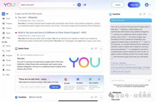 它使用AI来帮助理解搜索指令、对搜索结果进行排名并将查询结果翻译成包括编程语言在内的多种语言,搜索结果汇聚全网信息,还可以在像是Twitter和 WhatsApp等软件内作为插件使用。用户在使用You.com时,可以在图像、信息、编程和聊天等多种场景中进行选择,系统所显示的搜索结果也更加自然,与Google搜索结果中排名较前的结果都为付费广告截然相反。