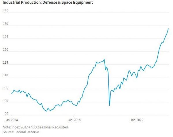 美联储的数据显示,自俄乌冲突爆发以来,美国国防和航天领域的工业产值增长了17.5%。