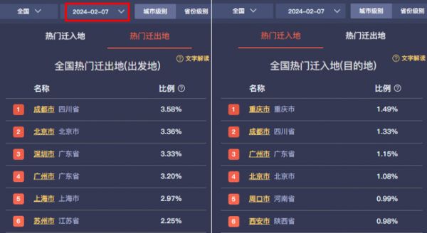 凤凰网风财讯拉出春节前(2月7日)后(2月18日)的全国热门出发地和目的地发现,除了北上广深,成都无论年前流出还是年后流入比例也都在TOP5之内,可见其对中国中西部的吸引力。