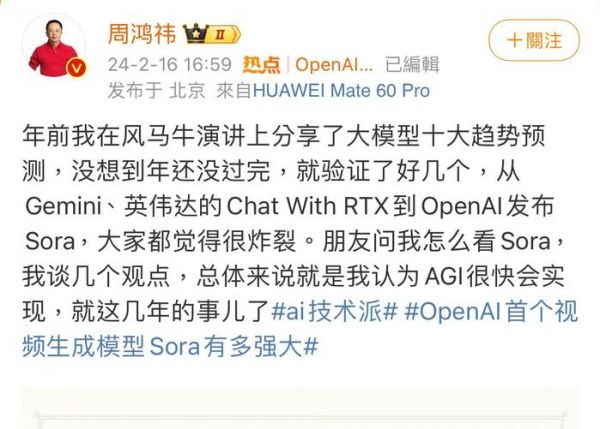 周鸿祎在见证Sora诞生后表示,Sora有别于其他文本视频生成工具,它能理解坦克是有巨大冲击力的,坦克能够冲毁汽车,而不会出现汽车撞毁坦克这样的事情发生。同时,他还认为,Sora只是OpenAI小试牛刀的产品,真正的好戏还在后头。
