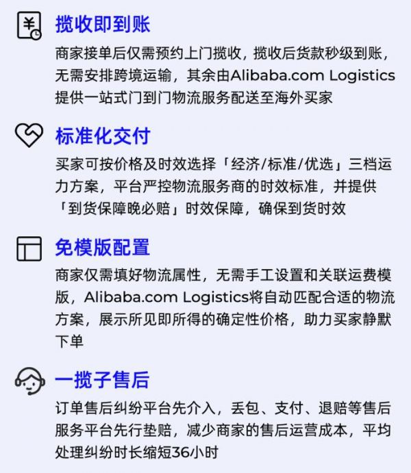 商家接单后仅需预约上门揽收,揽收后货款快速到账,无需安排跨境运输,阿里国际站物流会直接配送至海外买家。如果商家发货后产生订单售后纠纷,也是由平台介入。丢包、支付、退赔等售后服务同样由平台先行垫赔,减少了商家的售后运营成本。
