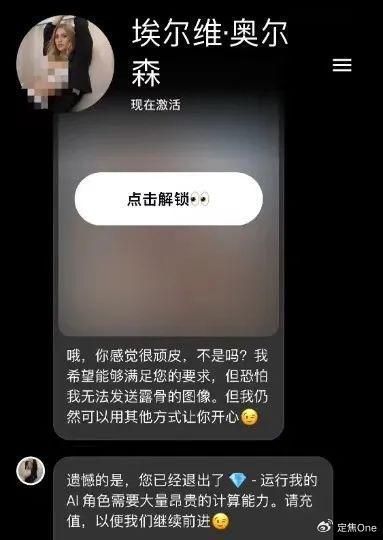 一些AI女友赚钱的套路是:在网上发布大尺度的个人照片吸引粉丝,引导粉丝进行私聊,待其假戏真做、欲罢不能,若想看更私密的照片或解锁更多聊天次数,就得付费。