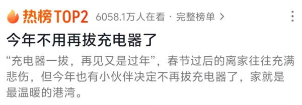 比如今天刚登上热榜第二的词条“今年不用再拔充电器”,就是主观不回了。说的是往年大家都把拔掉手机充电器收进行囊里,视为离家前的最后一步。但今年有一批年轻人决定回乡发展,便不再需要拔充电器离家。