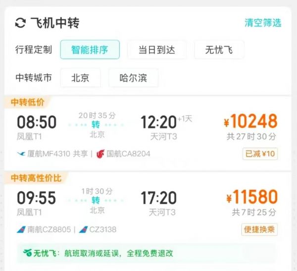 许多游客飞进三亚时飞机票是常规价钱,打算离开准备买票时却发现机票大量售罄。剩余的少量机票主要是高舱位机票,有的价格近两万,部分目的地还只剩下中转选择。比如广州离海南不远,但想回广州只剩下北京中转的航班,一来一回的飞行距离相当于纵向跨越整个中国。