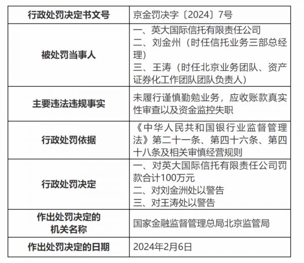 2月18日,国家金融监督管理总局北京监管局消息称,因未履行谨慎勤勉业务,应收账款真实性审查以及资金监控失职,英大国际信托有限责任公司(下称“英大信托”)被罚款合计100万元。同时对时任信托业务三部总经理刘金州,时任北京业务团队、资产证券化工作团队团队负责人王涛予以警告。