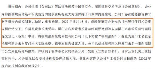 未名医药在2022年财报中提到,2022年5月18日,在时任董事会不知悉且未履行任何相关审议程序情况下,公司原董事长潘爱华、厦门未名原董事长兼总经理罗德顺等人向厦门市市场监督管理局提交登记(备案)申请,将杭州强新变更为厦门未名股东。杭州强新并未向厦门未名实际出资。
