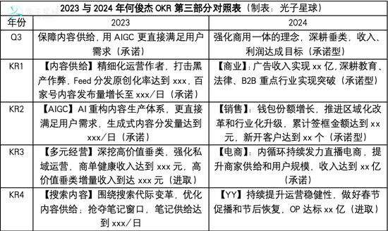 今年以前,何俊杰OKR第三部分通常会涉及到内容与服务化,鲜少直接关注利润本身。例如2022年的O3把重点放在经营效率上,去年O3则关注AIGC与内容供给,今年则因为对齐李彦宏的OKR,变为了“强化商用一体”、收入、利润等更为现实、可量化的指标。