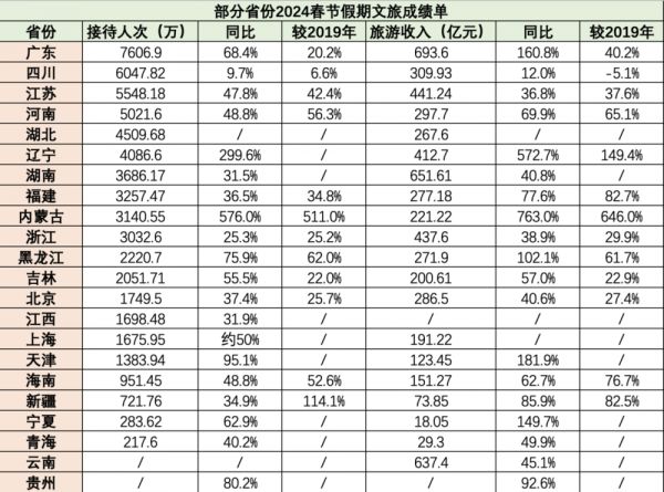 根据目前已公布的数据,从接待人次来看,广东、四川、江苏分居前三。2月10日至2月17日,广东全省共接待游客7606.9万人次,较2023年春节增长68.4%,较2019年春节增长20.2%。
