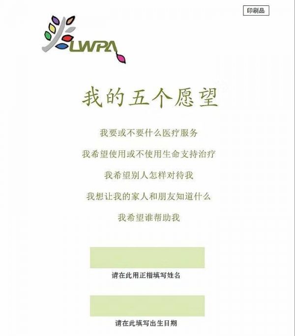 “选择与尊严”公益网站上的生前预嘱——《我的五个愿望》,是一份医疗护理指示文件,由人们在健康或意识清楚时签署。其主要目的是,在生命最后末期,避免使用不必要的创伤性抢救措施,尽量帮助将死之人自然而有尊严地离世。